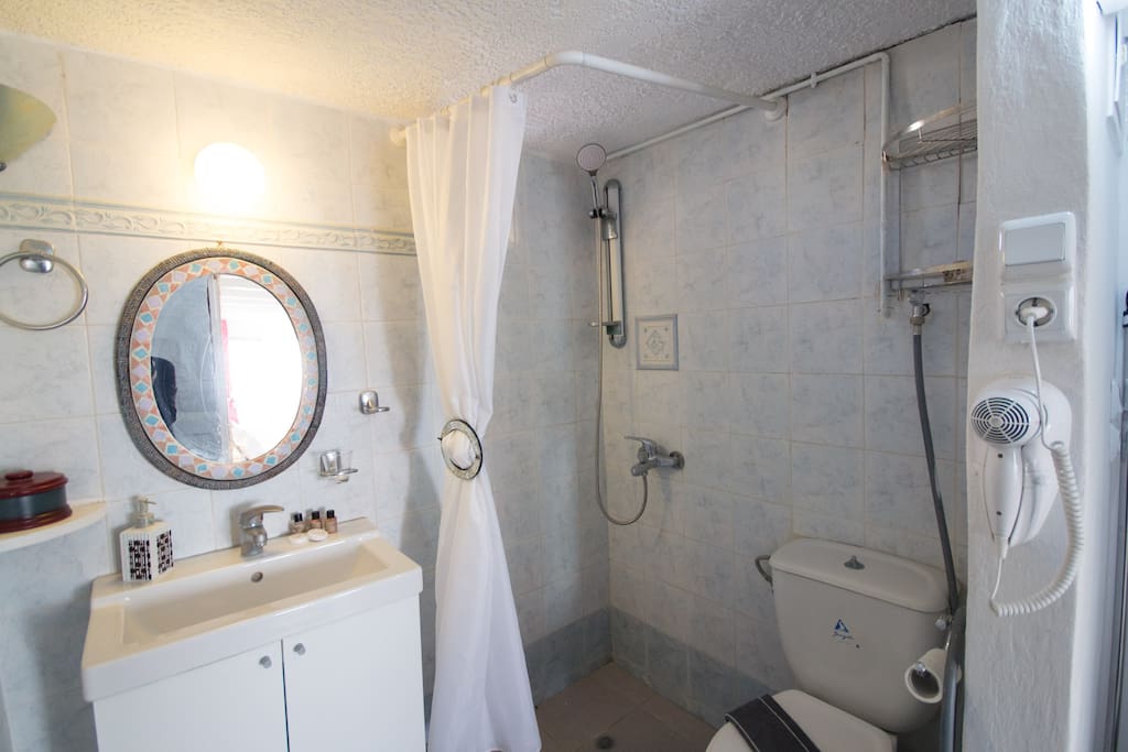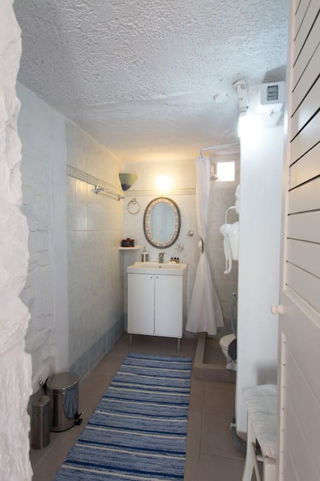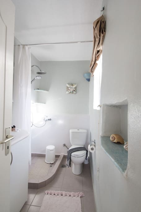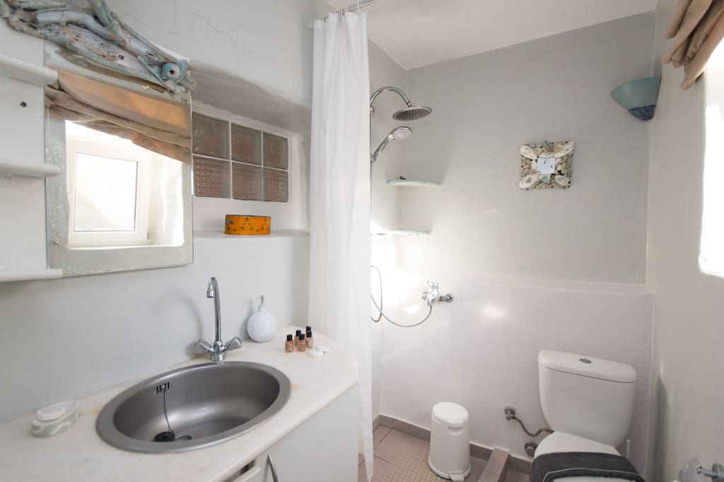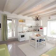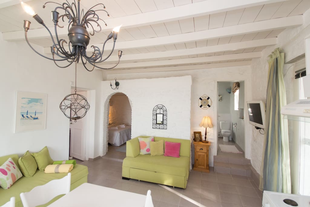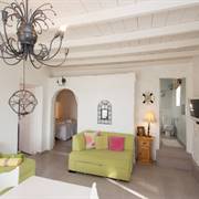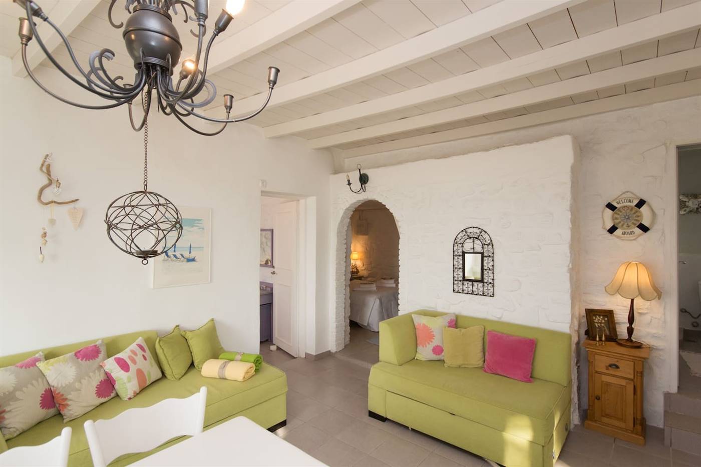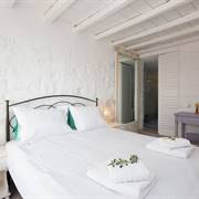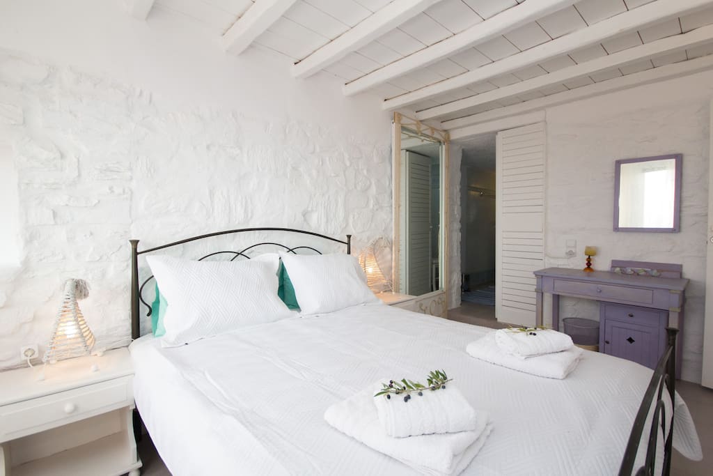 Un camino, un cortile con altalene per i bambini e una piccola corte beasketball. I colori sono quelli tipici delle Cicladi con tonalità di bianco e blu con una splendida vista sul Mar Egeo. La sua veranda è ideale per la colazione o rilassanti cocktail al tramonto.