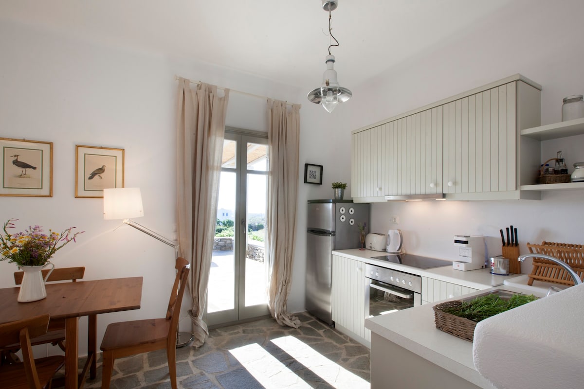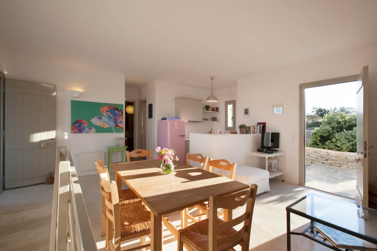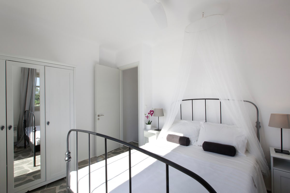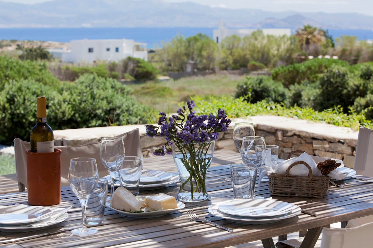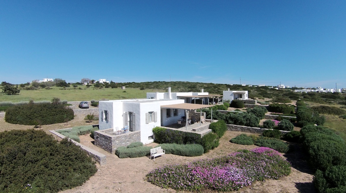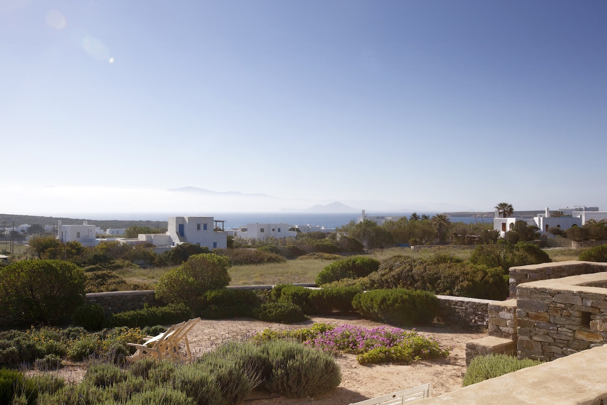 Le Kallisti Villas si trovano in una zona residenziale rurale ai margini delle spiagge protette di Santa Maria, sulla punta nord-est di Paros. Le baie di sabbia fine sono raggiungibili a piedi dalle ville (400 metri), tra cui la famosa spiaggia di surf di Santa Maria, la spiaggia di Mikri Santa con acque poco profonde ideali per i più piccoli (meglio di qualsiasi piscina), una scuola di immersioni subacquee, bar sulla spiaggia, taverne e un negozio di alimentari. Le taverne greche sono notoriamente accoglienti per le famiglie, ma gli ospiti possono anche gustare le specialità locali presso la villa telefonando per un cibo da asporto (dovrai ritirarlo tu stesso).