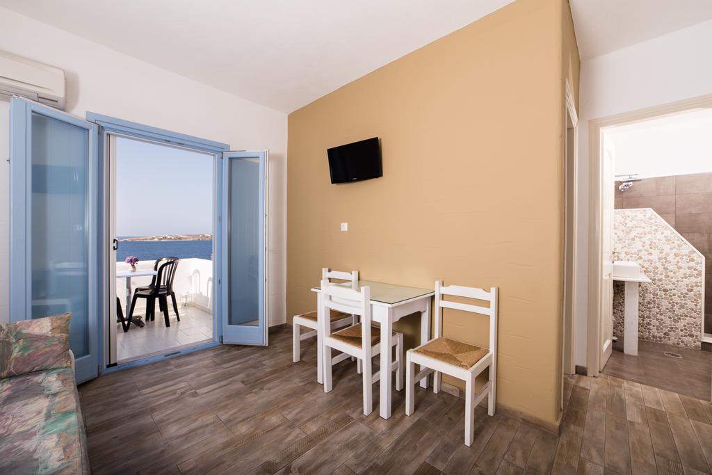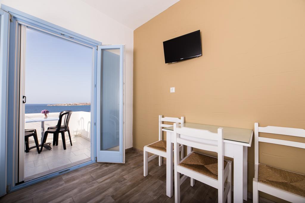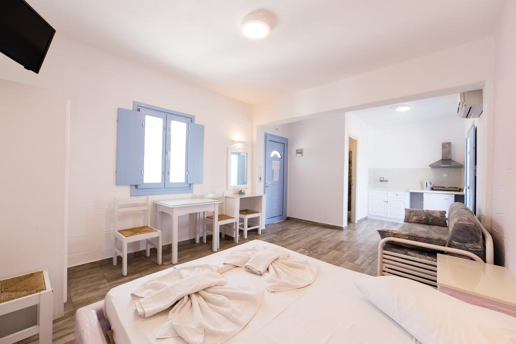 Tutti i monolocali e gli appartamenti dello Stratos sono dotati di balcone privato, alcuni con vista sul Mare Egeo. Le unità presentano inoltre l'aria condizionata, un angolo cottura, una TV e un bagno privato con doccia.