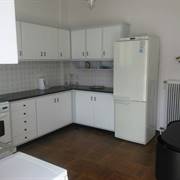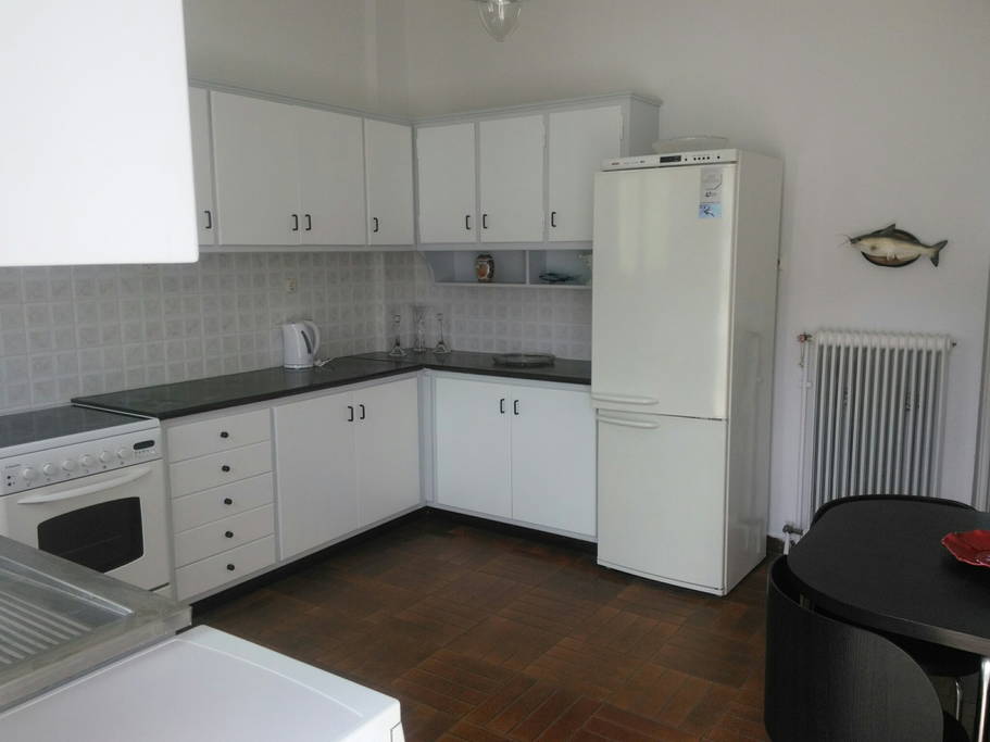 C'è una grande cucina con un tavolo da pranzo e la cucina è attrezzata con frigorifero, forno e lavastoviglie.