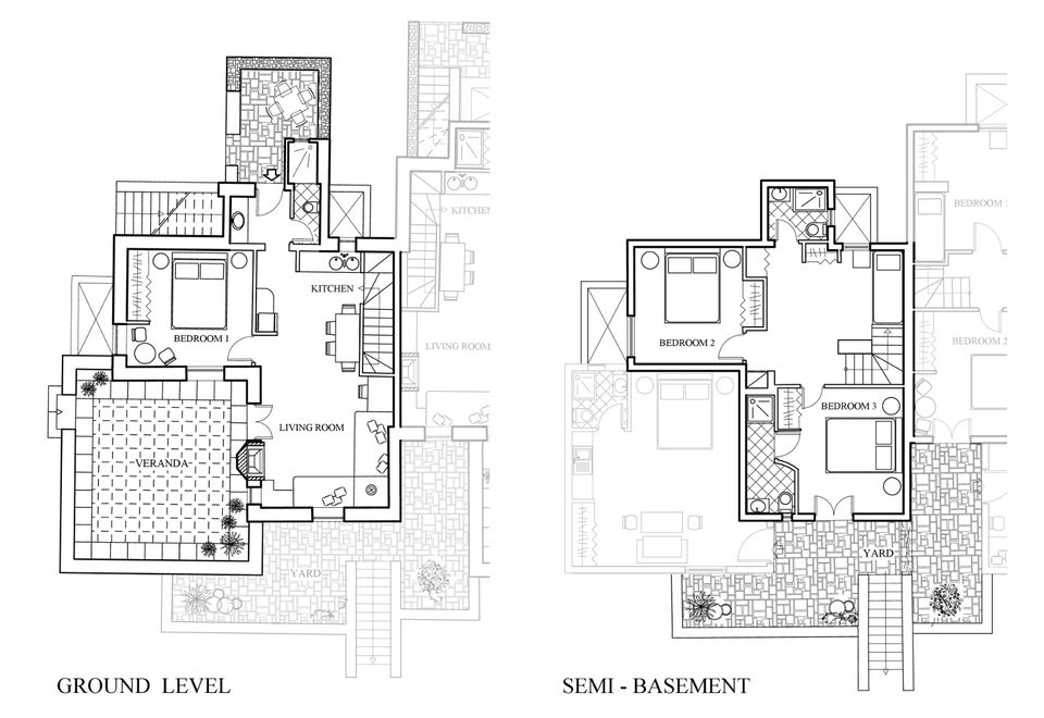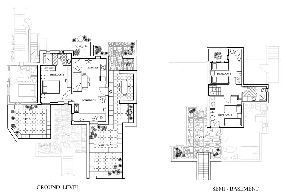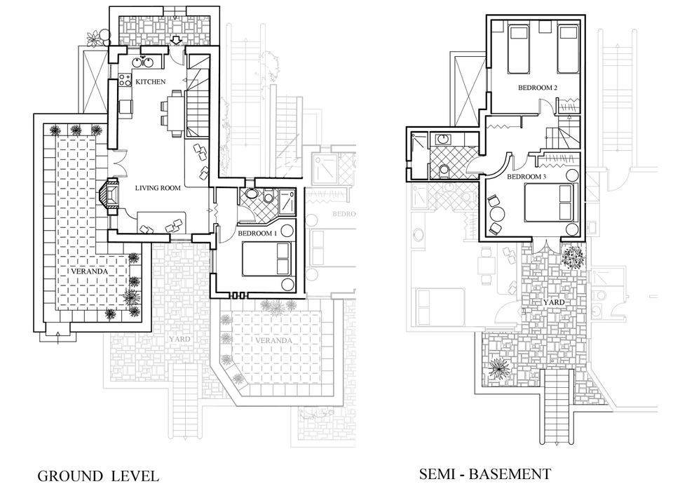 Villa di 115 m²: Sviluppato su due livelli, con ampie verande ; una camera da letto matrimoniale, un bagno, un salotto con camino e una cucina al piano superiore e due camere da letto con due bagni al piano inferiore; tutte arredate in uno stile minimale e colori. Dotato di aria condizionata per camere da letto, TV, letto e materassi ( STROM)