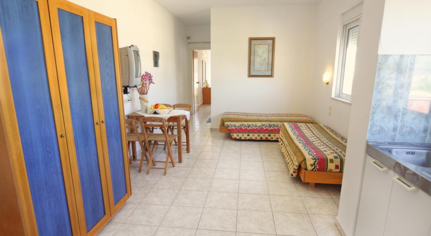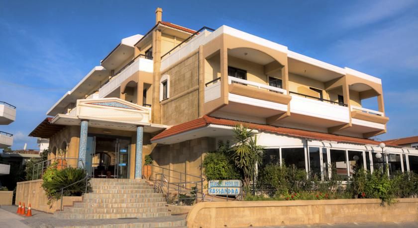 Gli appartamenti del Kassandra si affacciano su un balcone e vantano una vista sulla piscina e sul giardino. Includono inoltre un angolo cottura con zona pranzo, frigorifero e fornelli, un bagno completo di doccia e asciugacapelli, una TV e un telefono.