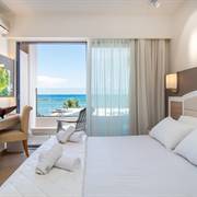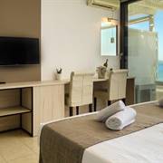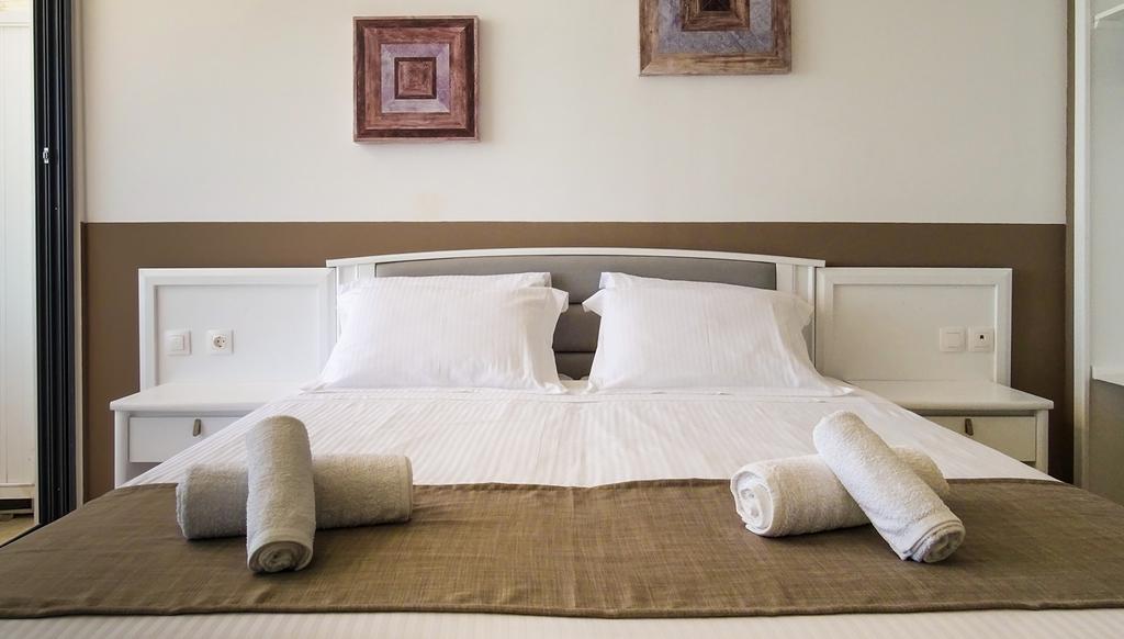 Tutte le camere sono dotate di aria condizionata gratuita, TV satellitare, frigorifero, bagno con doccia e asciugacapelli, e, in alcuni casi, vista sul giardino o sul Mar Egeo.