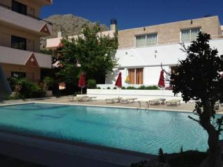 Il saint Konstantin Apartments è diviso in blocchi separati che circondano la grande piscina. L'hotel dispone di monolocali con due letti singoli (ca. 20 mq), bilocali (ca. 60 mq), due camere da letto appartamenti (circa 85 mq), suite di lusso con piscina privata (ca. 75 mq) con verande (circa 100 mq). Tutti gli appartamenti a Saint Konstantin con bagno e doccia / WC, angolo cottura, aria condizionata e ampi balconi con vista mare. C'è un bar a bordo piscina che offre l'unica piscina a Stegna 'e un bel caffè / snack bar con giardino pensile. È disponibile una sala internet in loco. Tradizionali taverne / bar, supermercati, negozi Tourtist, noleggio auto, tutti facilmente raggiungibili a piedi a un passo. Servizi: Vasca da bagno, doccia, wc, angolo cottura, frigorifero, utensili da cucina, balcone, vista mare, piscina, vista giardino, vista montagna, piscina all'aperto, snack bar, wi-fi nella hall, aria condizionata. Pulizia 7 volte a settimana, cambio biancheria e asciugamani 2 volte a settimana.