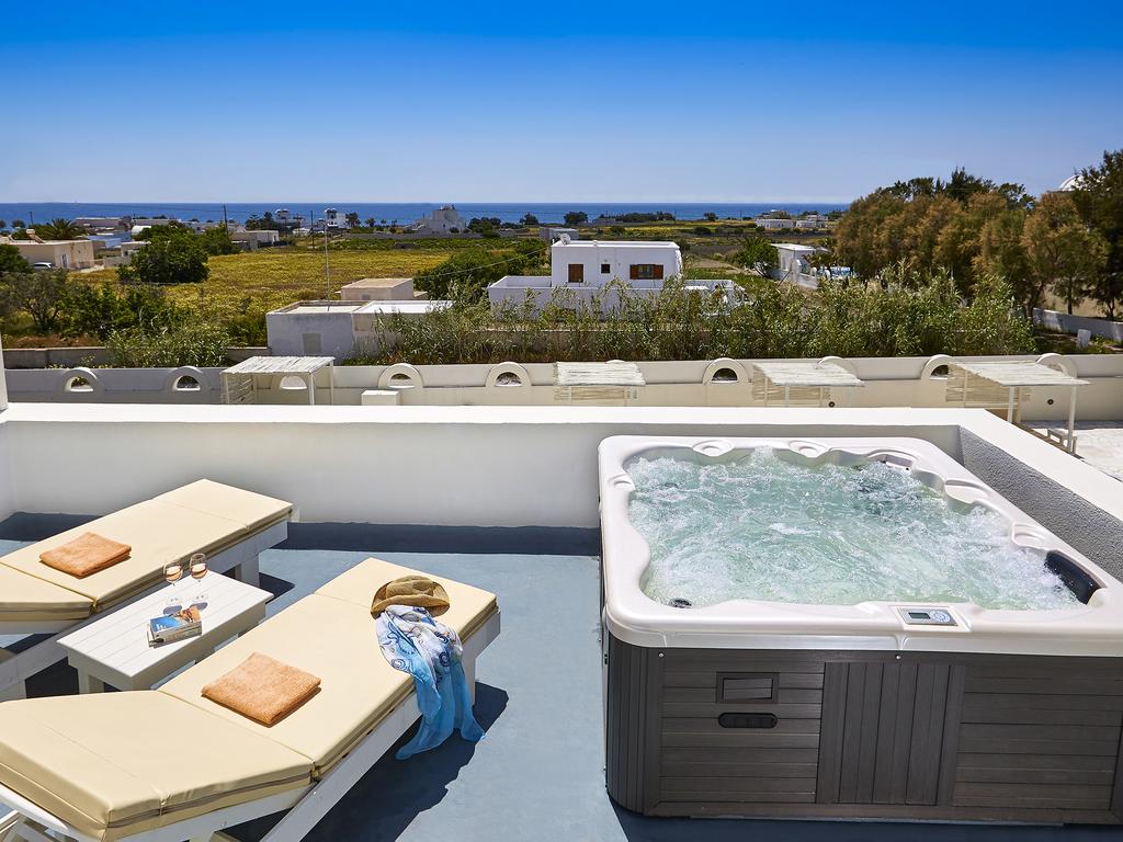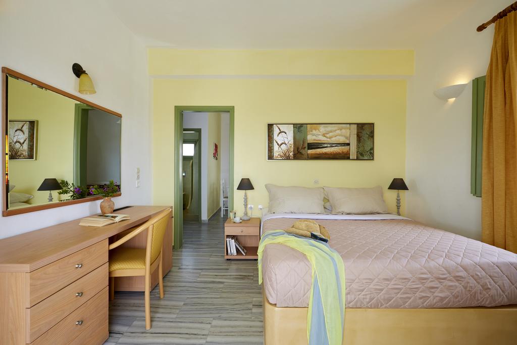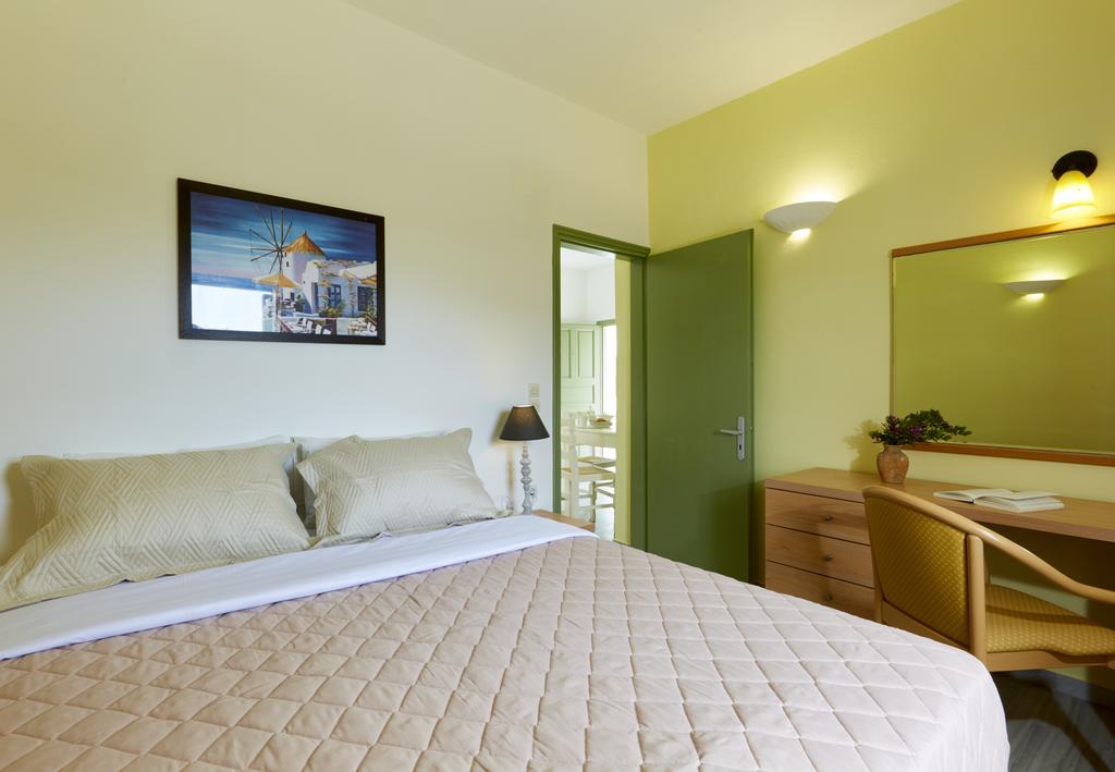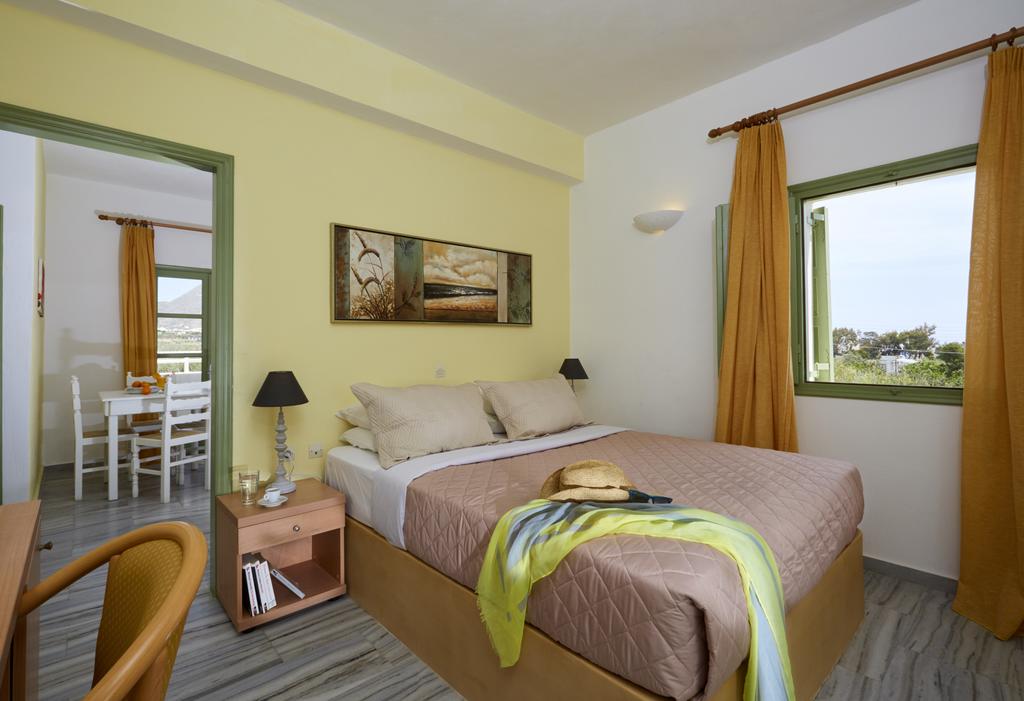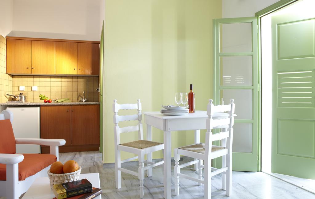 Tutti climatizzati e arredati in moderno stile cicladico, gli alloggi includono un angolo cottura con frigorifero, un balcone o un patio con vista sul Mar Egeo e sulle montagne, una TV e un set di cortesia. Alcuni comprendono una camera da letto e un soggiorno separati.