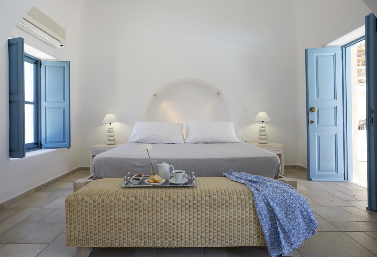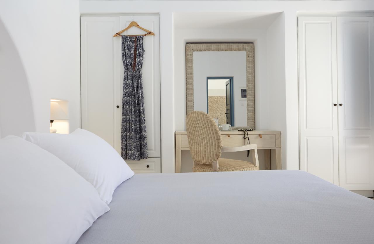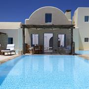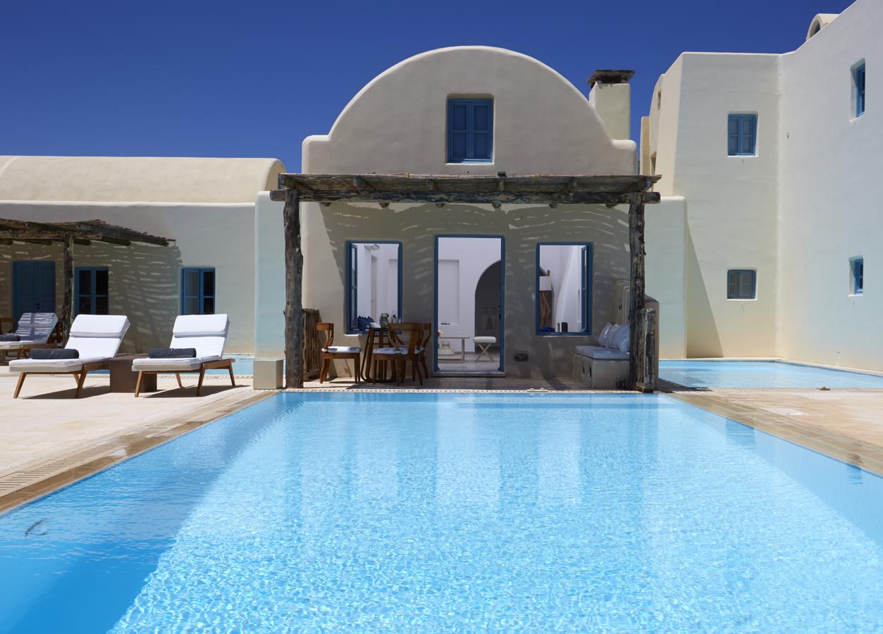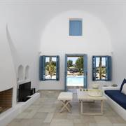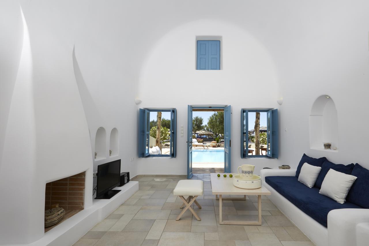 Imbiancata a calce e dotata di patio privato con piscina, giardino e vista sul Mar Egeo, ciascuna suite dispone di letti da incasso, camino, TV a schermo piatto con lettore DVD, minibar, aria condizionata e bagno a mosaico completo di prodotti naturali Korres, pantofole, accappatoi e, in alcuni casi, anche di vasca idromassaggio.