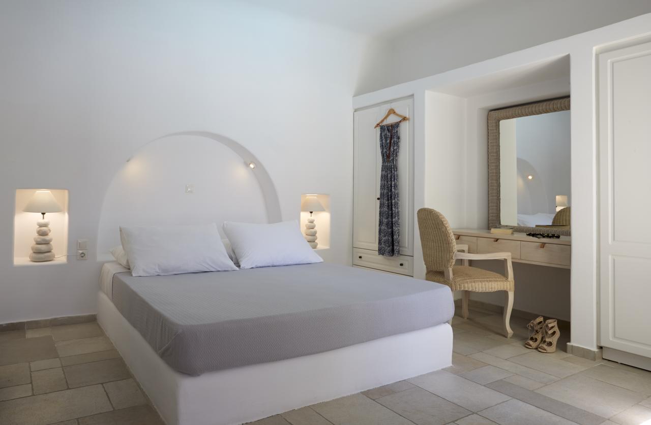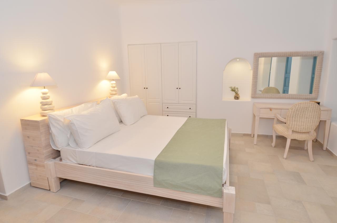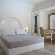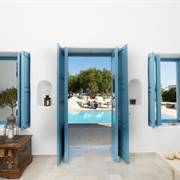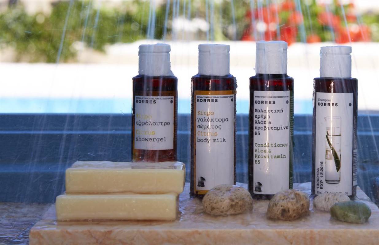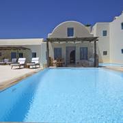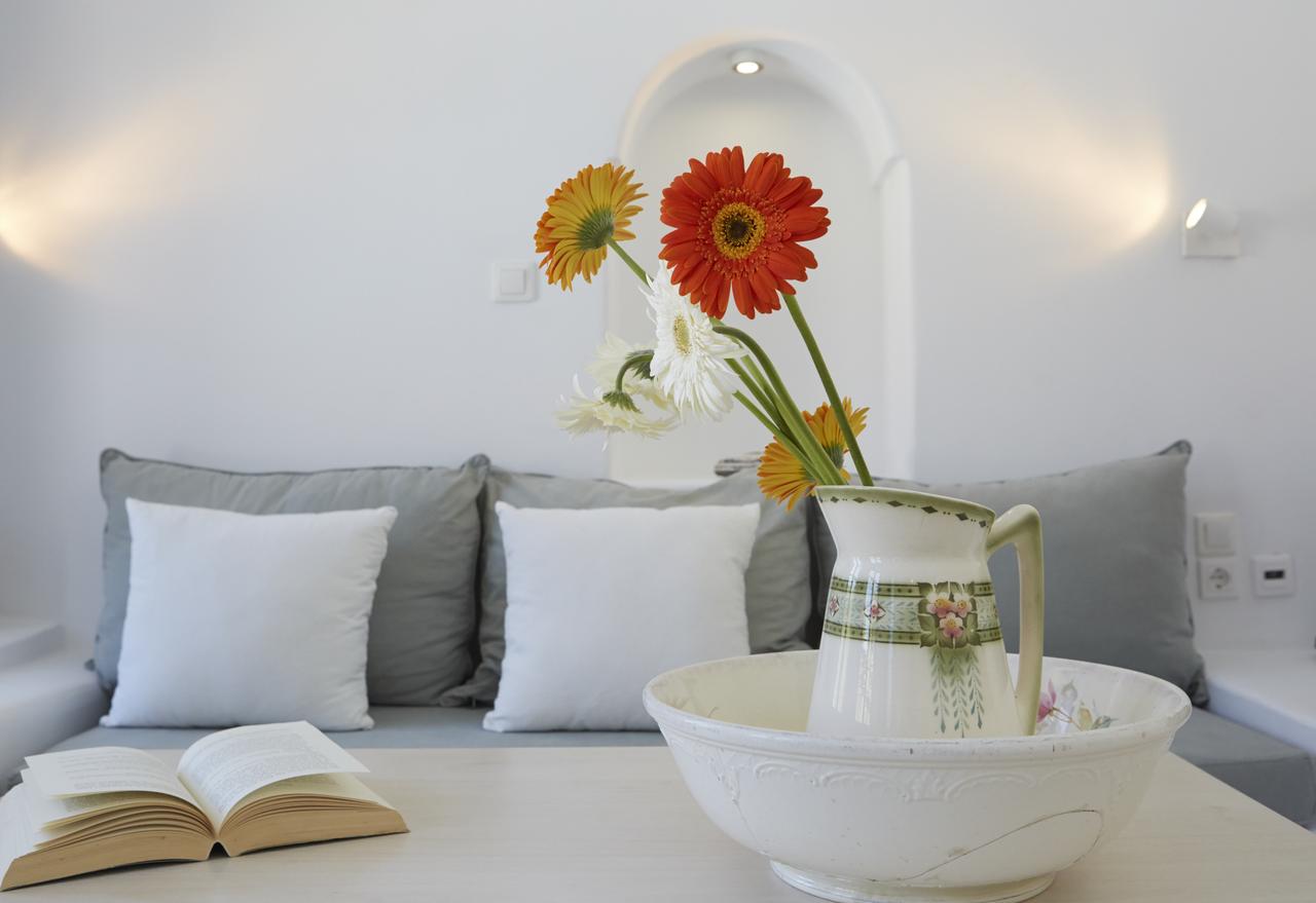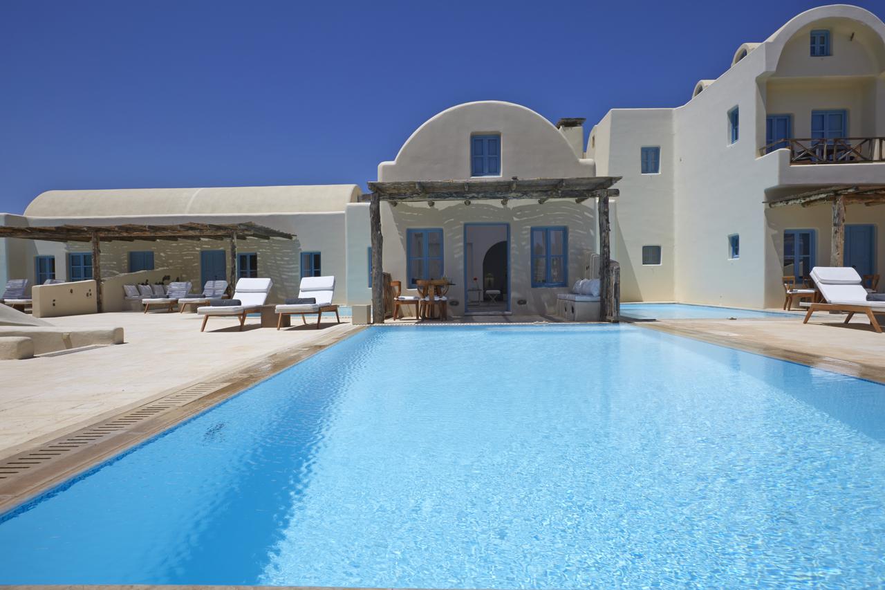Imbiancata a calce e dotata di patio privato con piscina, giardino e vista sul Mar Egeo, ciascuna suite dispone di letti da incasso, camino, TV a schermo piatto con lettore DVD, minibar, aria condizionata e bagno a mosaico completo di prodotti naturali Korres, pantofole, accappatoi e, in alcuni casi, anche di vasca idromassaggio.