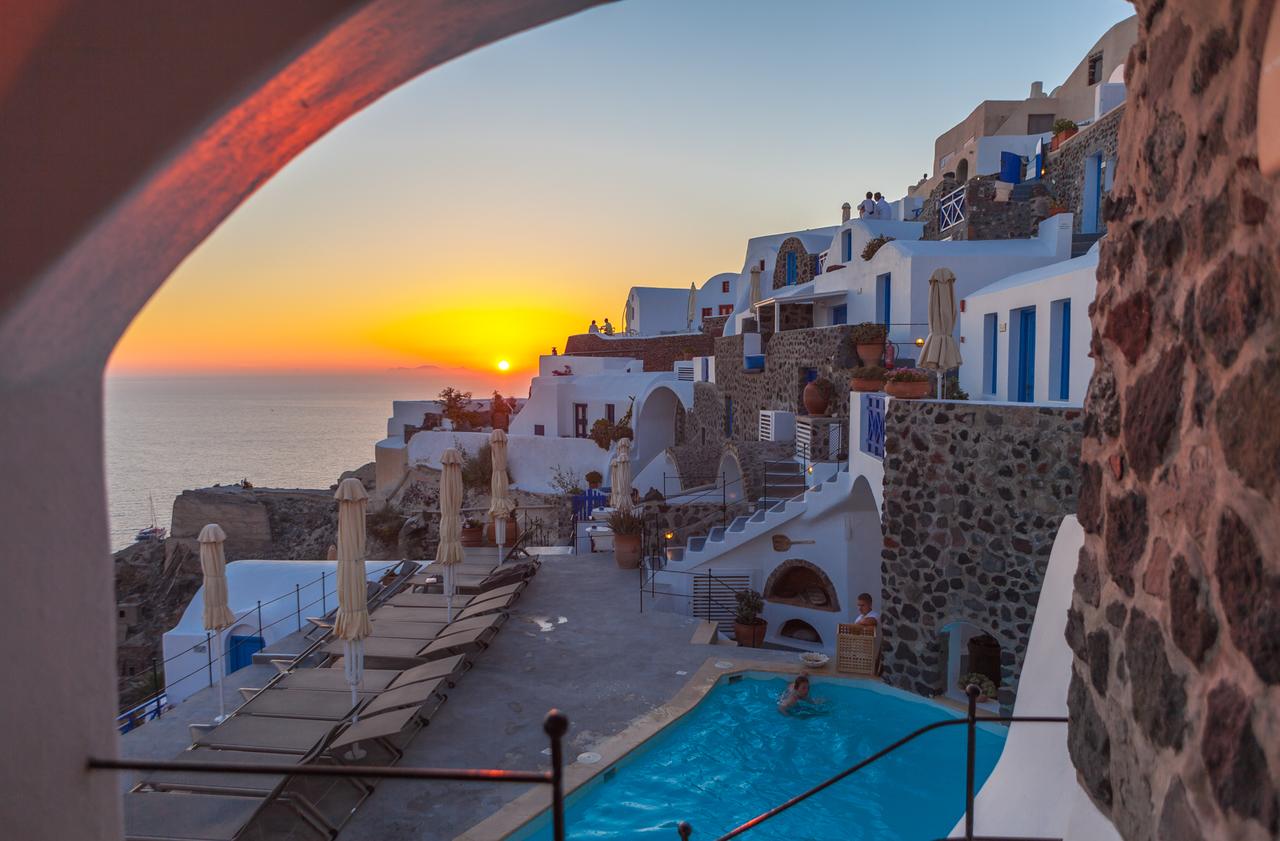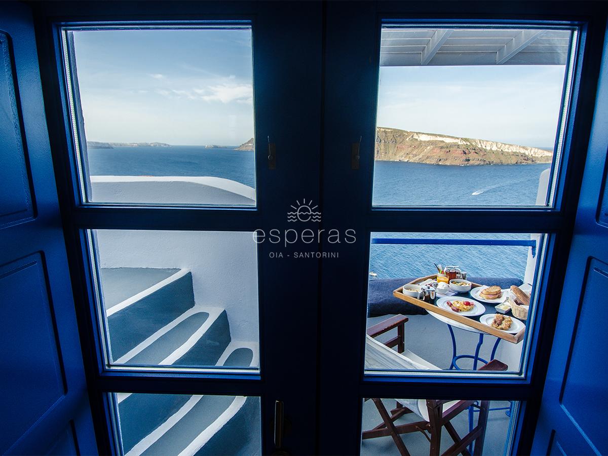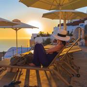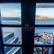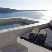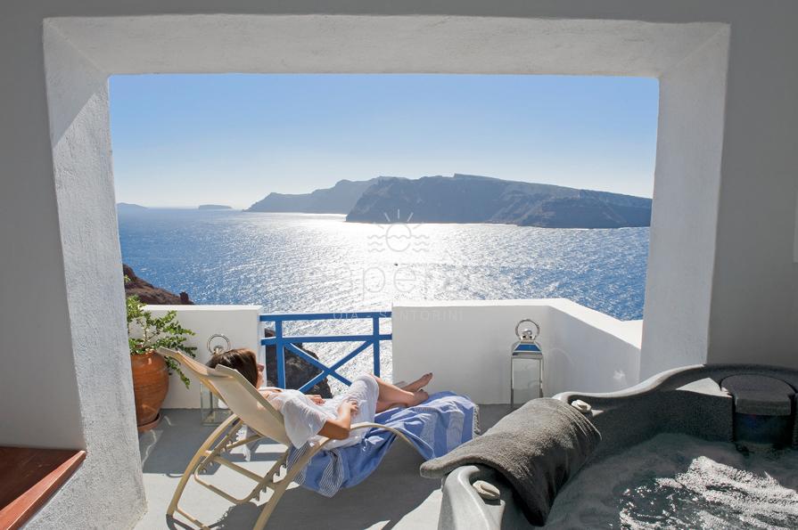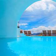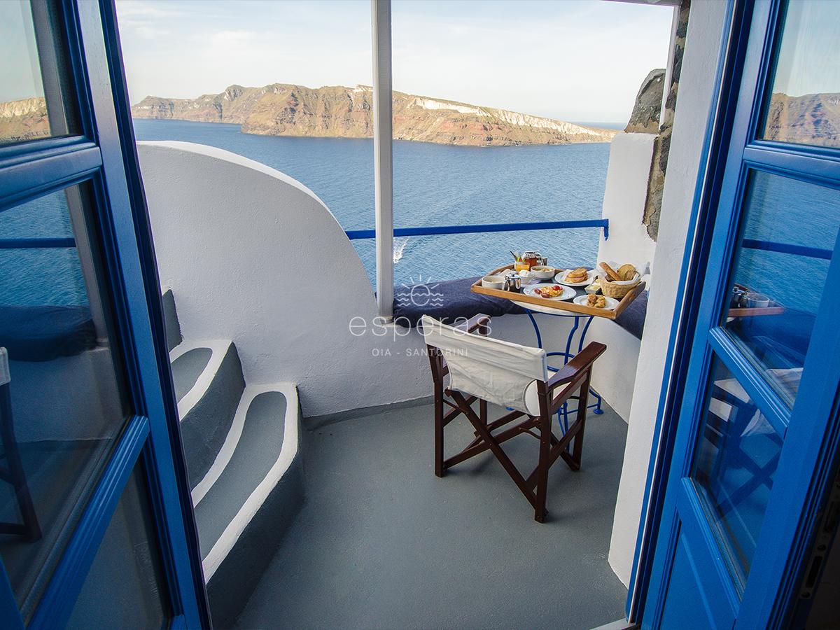 Arroccato su una scogliera, di fronte al vulcano e alle isolette, l'Esperas di Oia vanta una piscina scolpita nella roccia e camere con viste impareggiabili sul Mar Egeo.