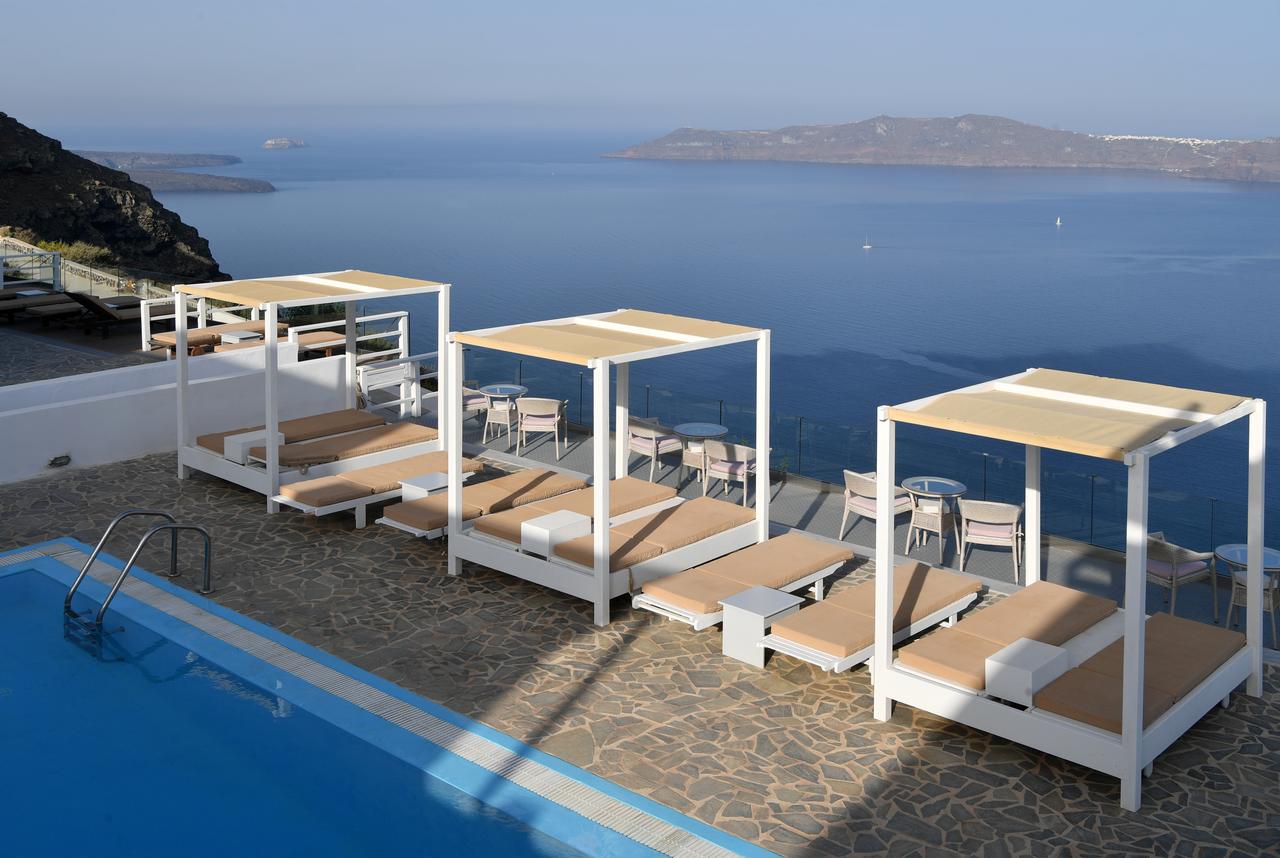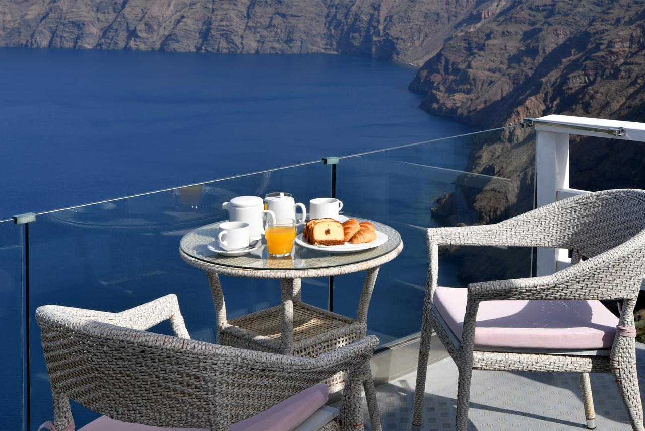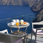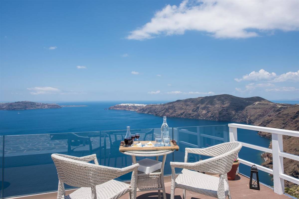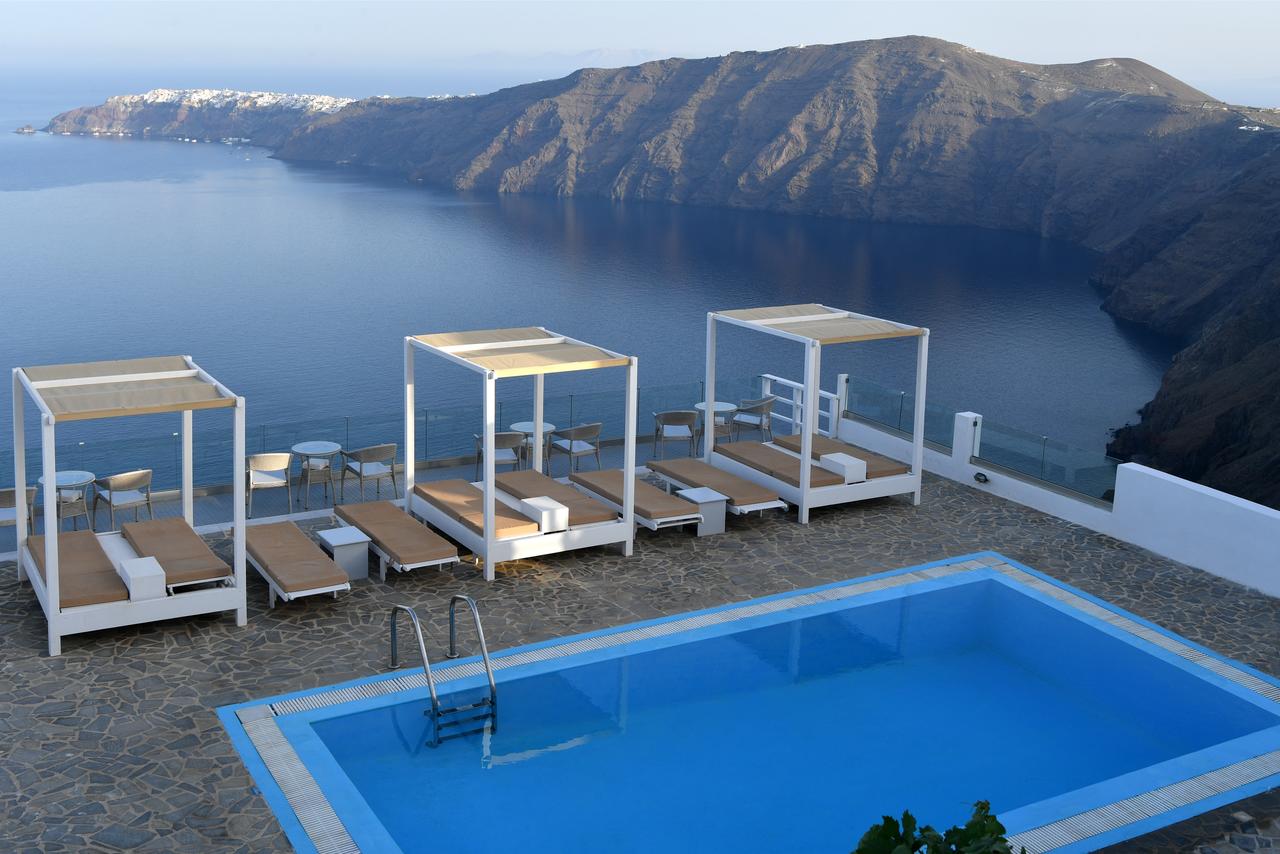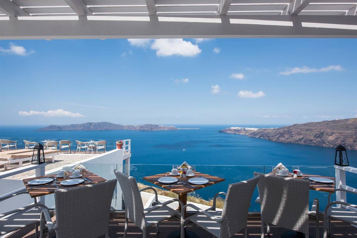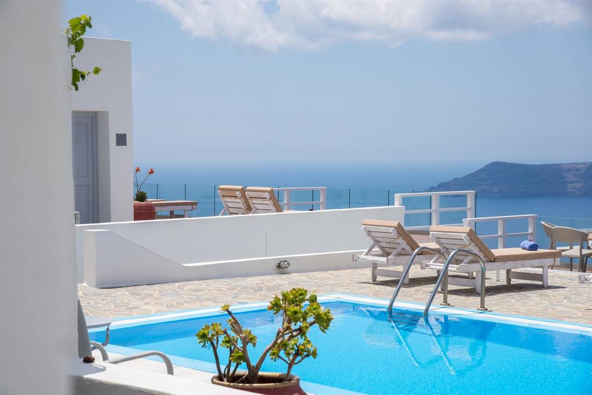 Potrete gustare la colazione a bordo piscina o rilassarvi sulla terrazza e godere della vista sconfinata sul mare e sulla Caldera.