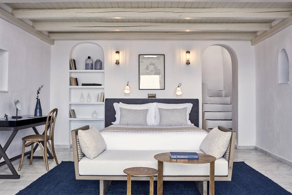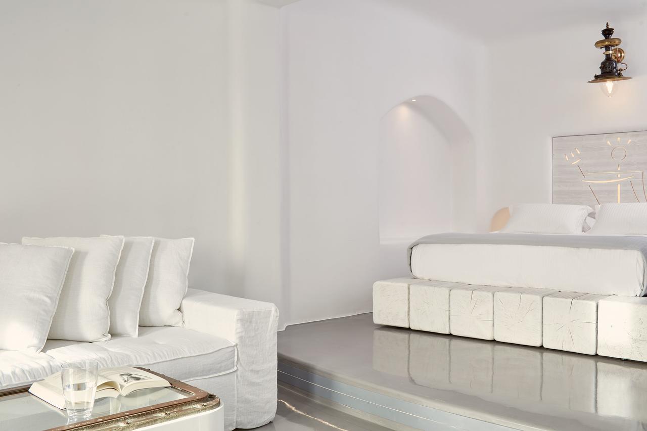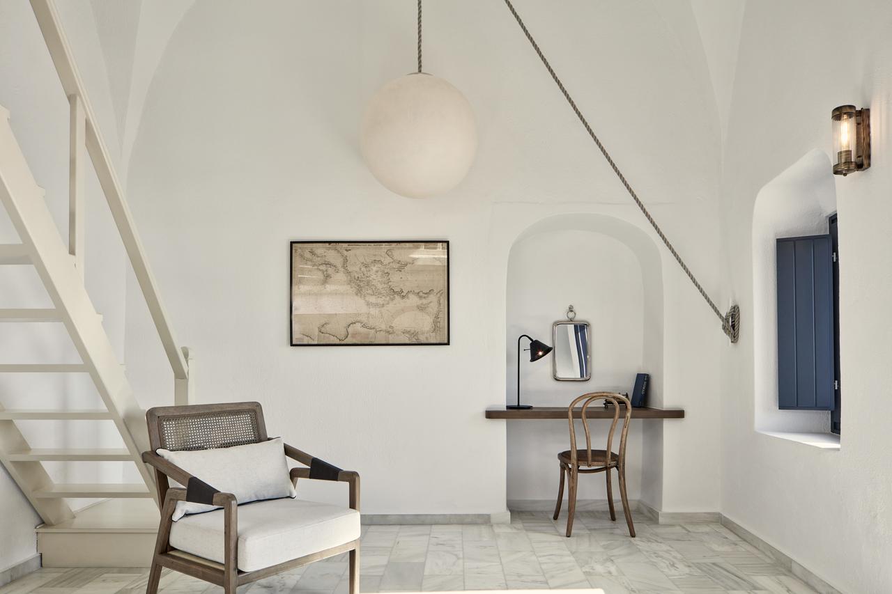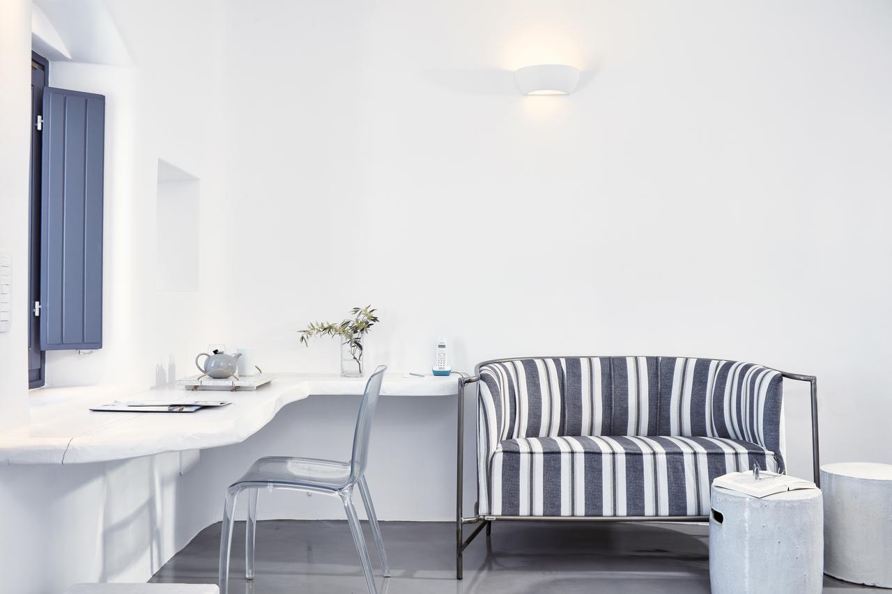 Die Apartments und Suiten im Hotel Homeric Poems sind einfach, aber elegant eingerichtet und in Anlehnung an den traditionellen kykladischen Stil gestaltet. Die Zimmer verfügen über einen komfortablen Sitzbereich.