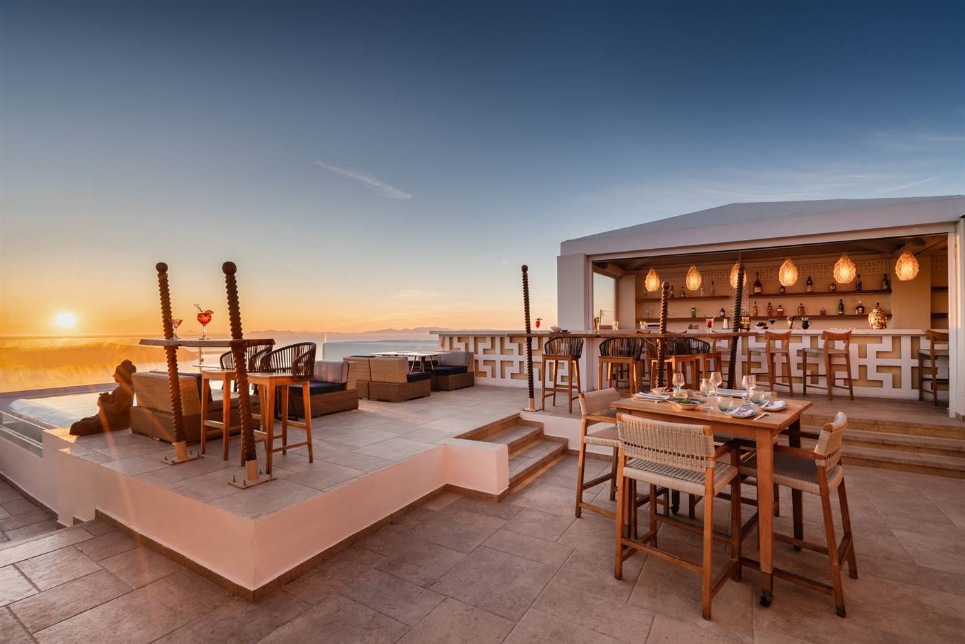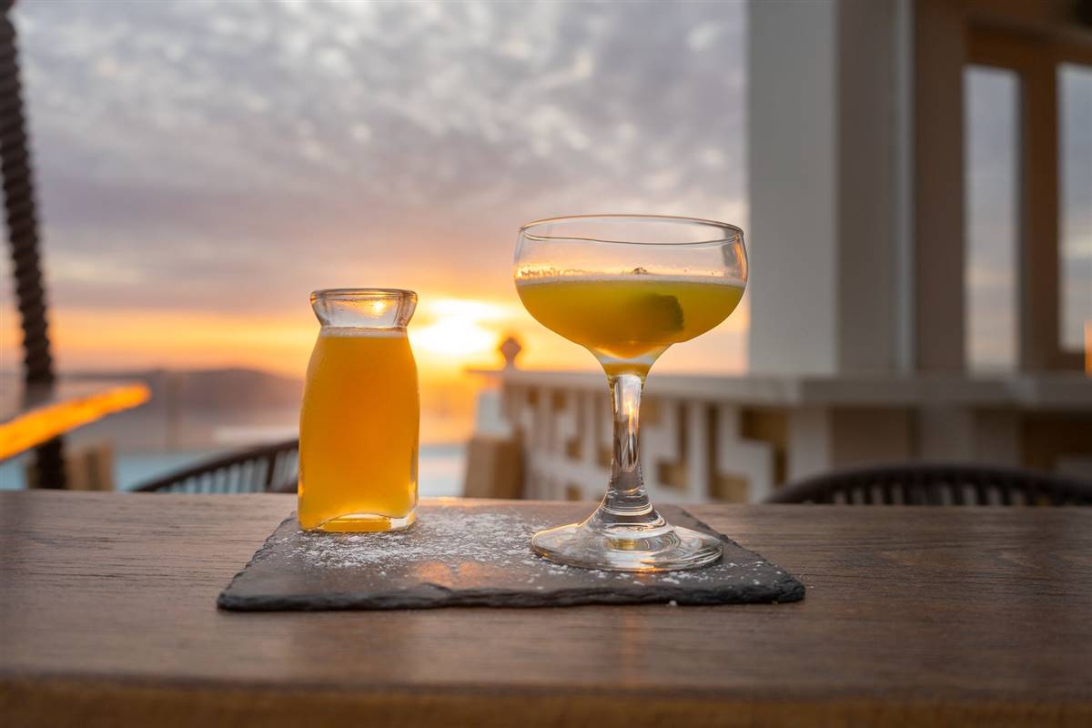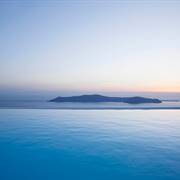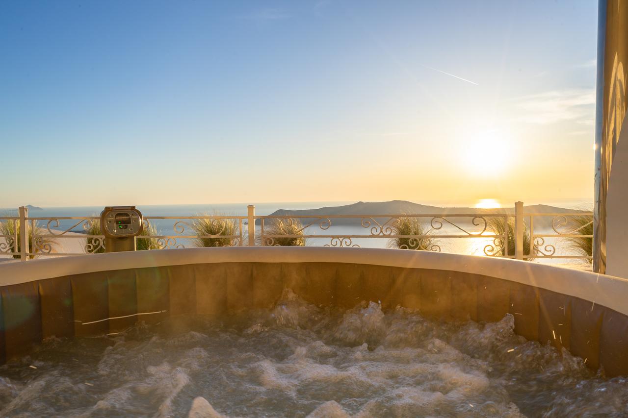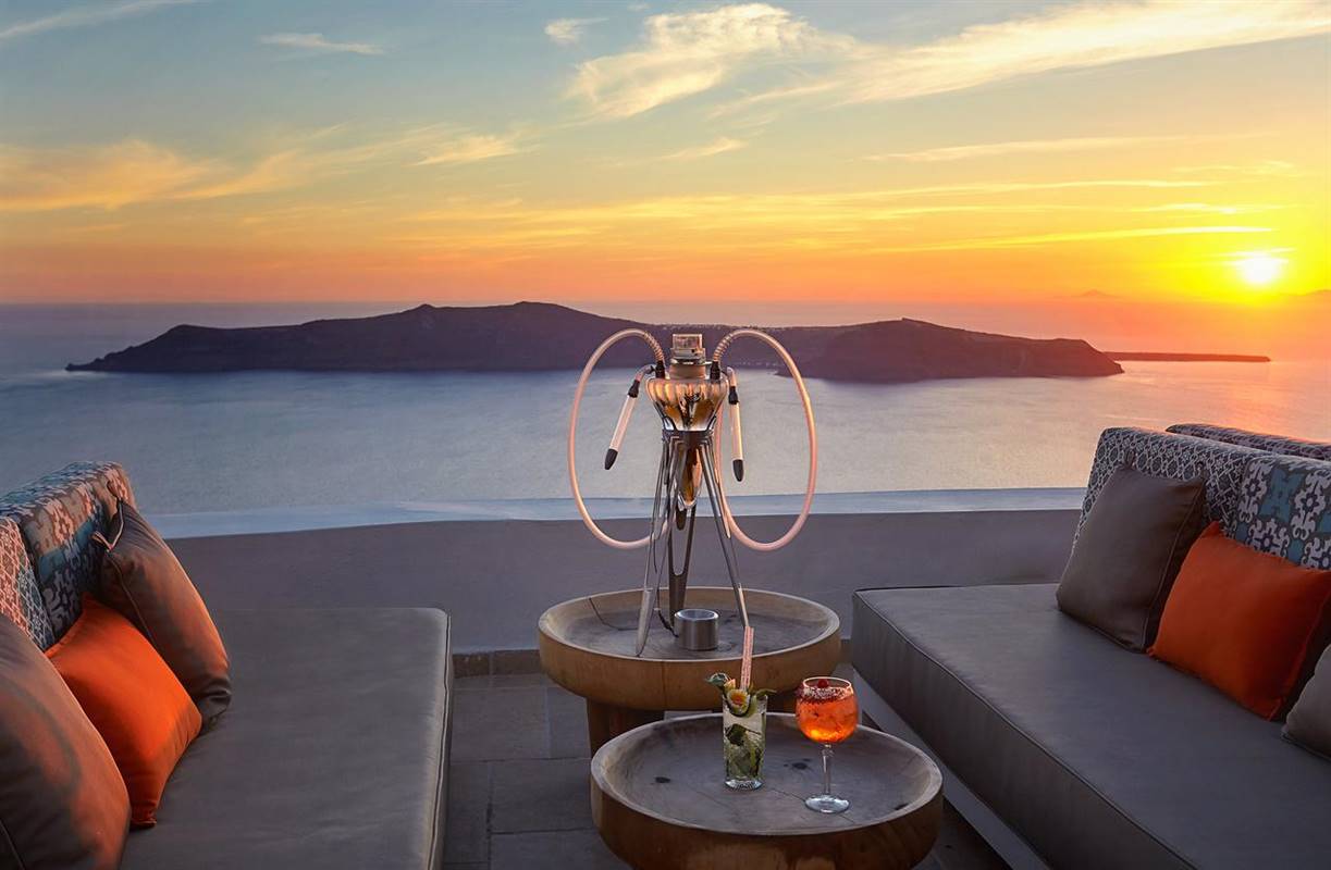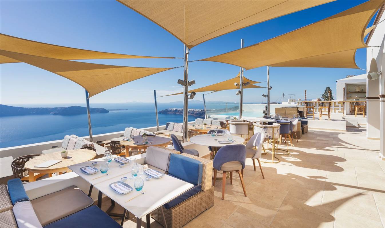 L'area della piscina presenta una veranda di 250 m² dotata di lettini e affacciata sulla caldera, e un bar che serve drink, cocktail e un vasto assortimento di champagne.