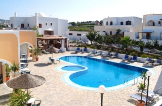 Karterados è un villaggio tradizionale, proprio nel centro dell'isola di Santorini. A pochi minuti di auto sono le spiagge più tranquille di Karterados & Monolithos, così come alcune taverne di pesce. Il complesso è composto da 42 appartamenti tradizionali, villette, monolocali e camere. A pochi passi dall'hotel si trova la piazza principale del paese, con vari piccoli negozi, mini market, luoghi di caffè, taverne, la panetteria e chioschi locali.