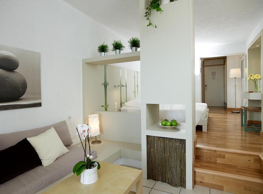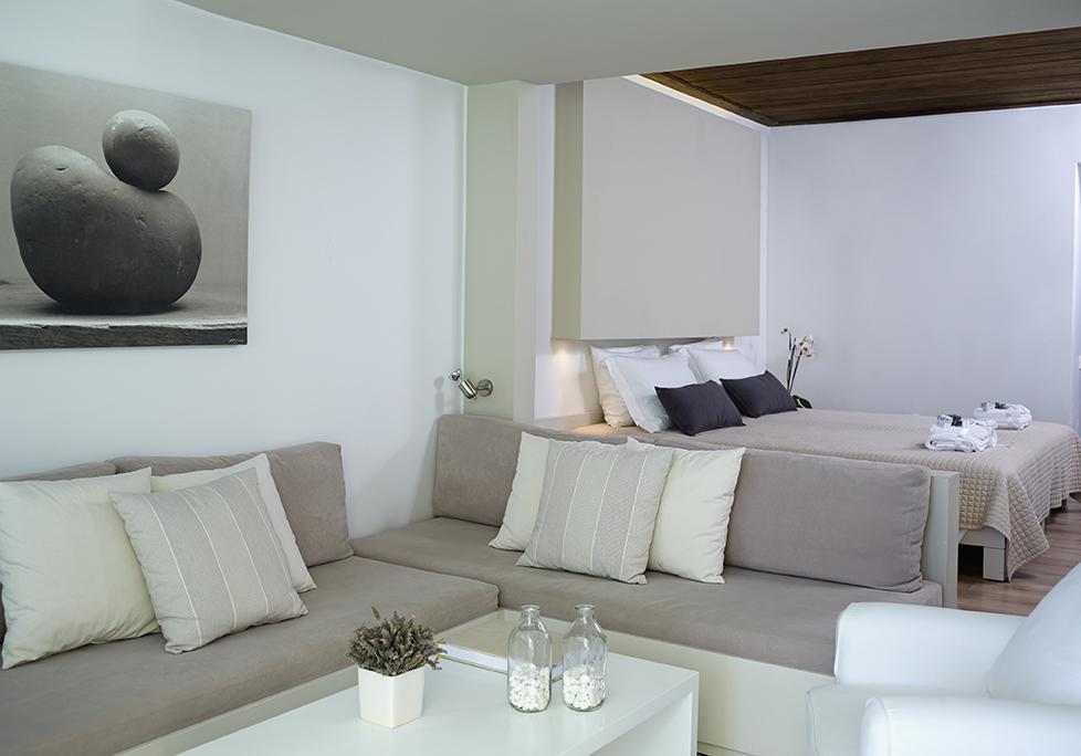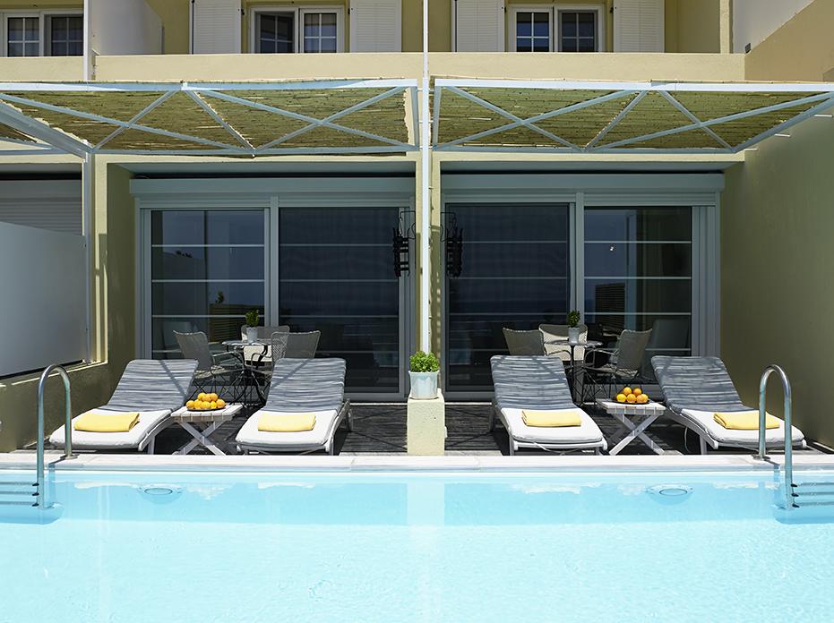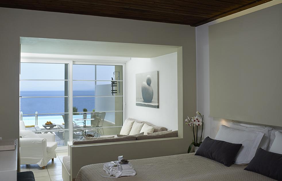 Caratterizzate da una combinazione di arredi contemporanei e tradizionali, le camere e le suite dell'Atrium sono climatizzate e includono una TV satellitare a schermo piatto, una cassaforte, un frigorifero e un bagno moderno con doccia o vasca e set di cortesia. La maggior parte delle sistemazioni regala una vista sul mare, mentre alcune presentano una piscina privata o una vasca idromassaggio.