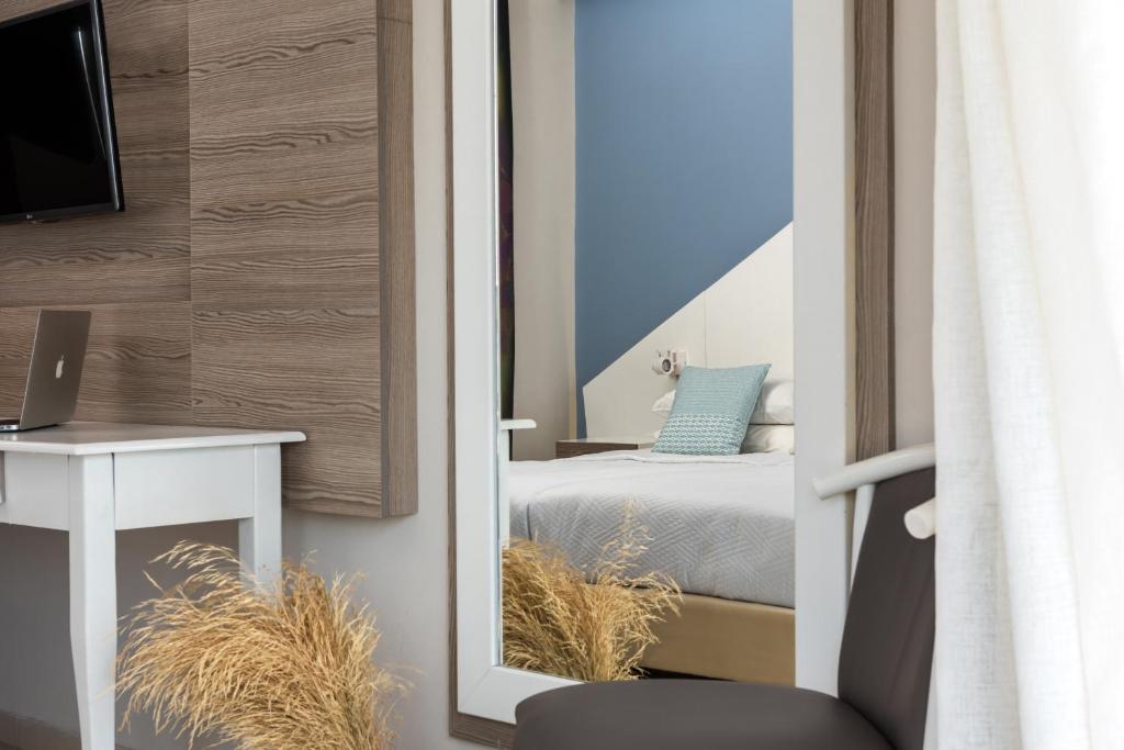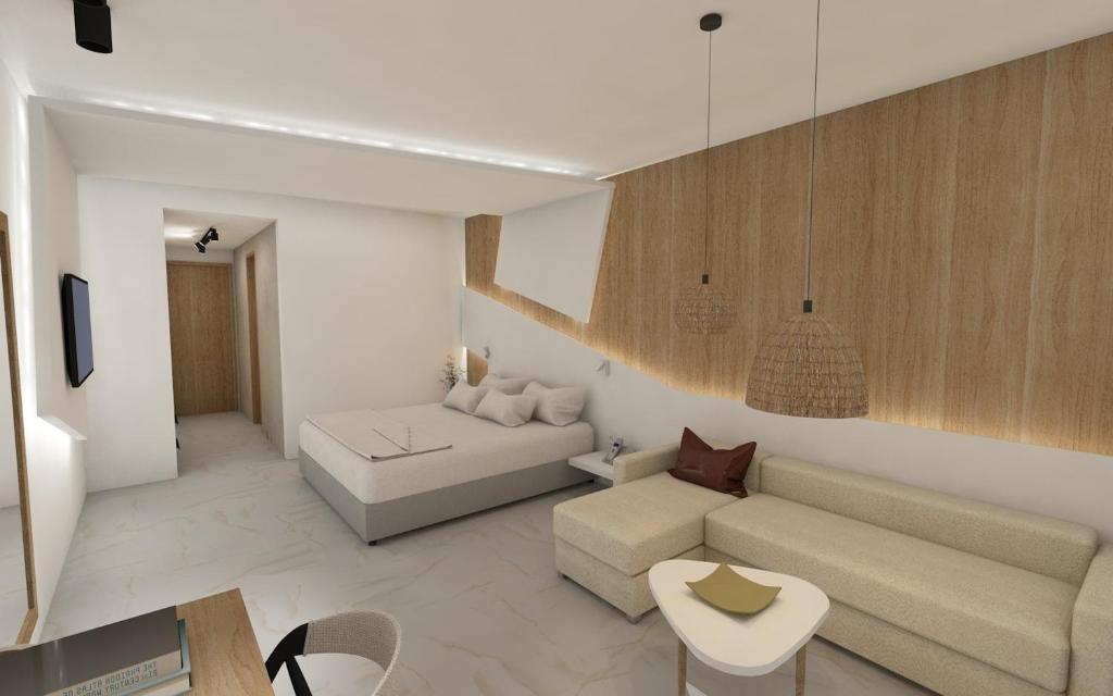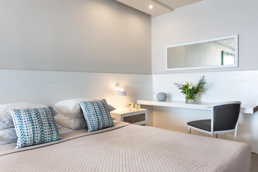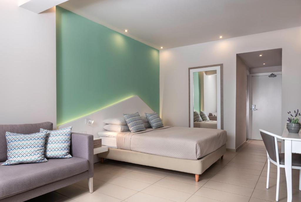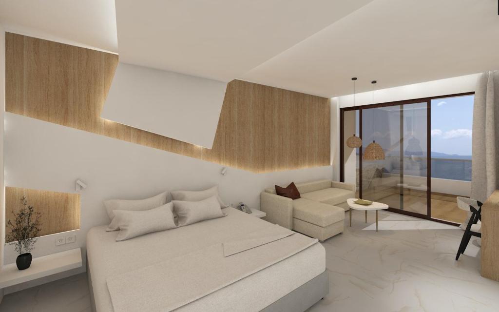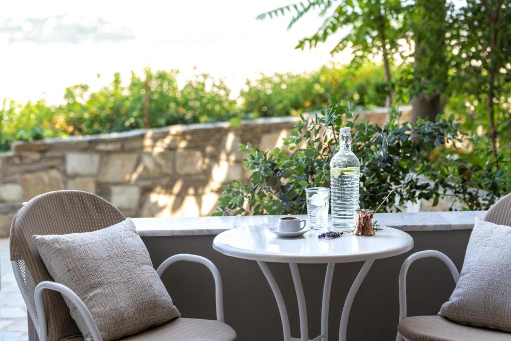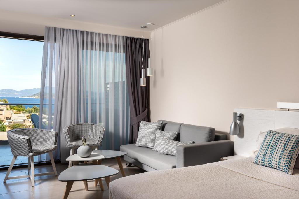 Tinteggiate in tonalità tenui, le camere e le suite sono dotate di arredi in stile contemporaneo, balcone o terrazza con mobili da esterno, vista sul Mar Egeo, sulla piscina o sui giardini, aria condizionata, TV LCD con canali satellitari, connessione WiFi gratuita e bagno moderno con pantofole e set di cortesia. Alcune presentano una piscina privata o una vasca idromassaggio.