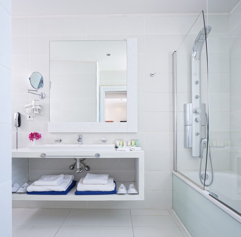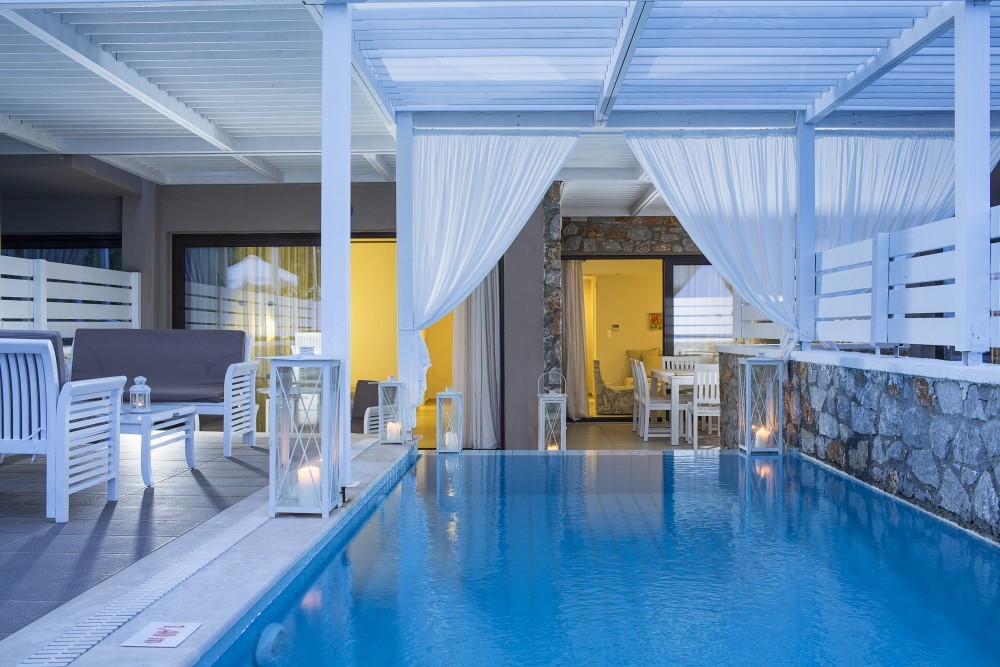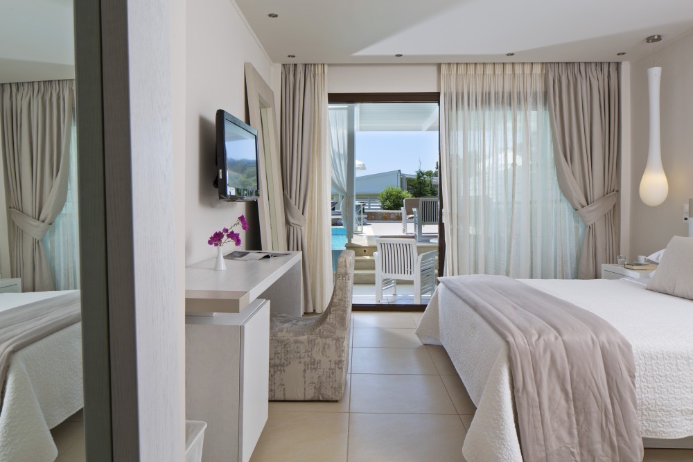 Climatizzate e arredate in stile moderno con colori tenui, le camere e le suite sono provviste di terrazze o balconi arredati, vista sul Mar Egeo, sulla piscina o sui giardini, TV LCD con canali satellitari, connessione Wi-Fi gratuita, bagni moderni con pantofole e set di cortesia e, in alcuni casi, di piscine private o vasche idromassaggio.