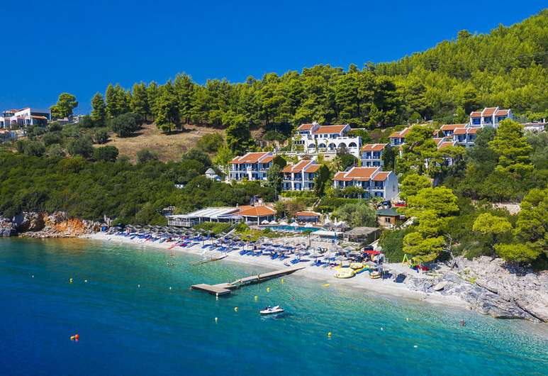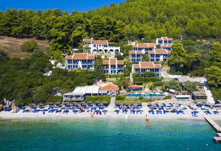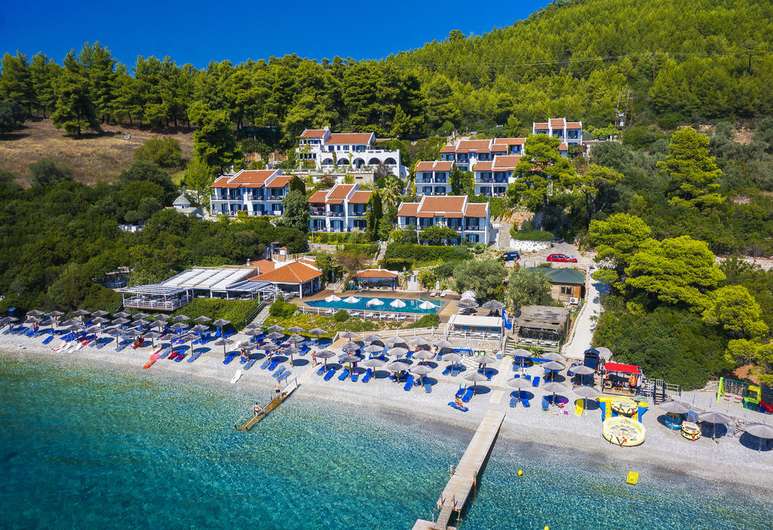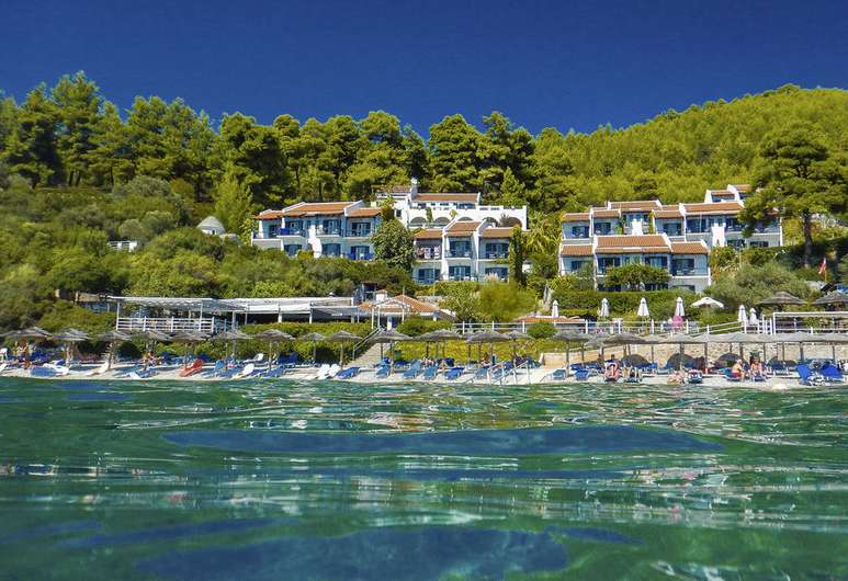 Adagiato sulla spiaggia di Panormos a Skopelos, l'Adrina Beach Hotel offre una spiaggia privata, una piscina di acqua marina all'aperto con lettini e ombrelloni, e la connessione Wi-Fi gratuita in tutta la struttura.
