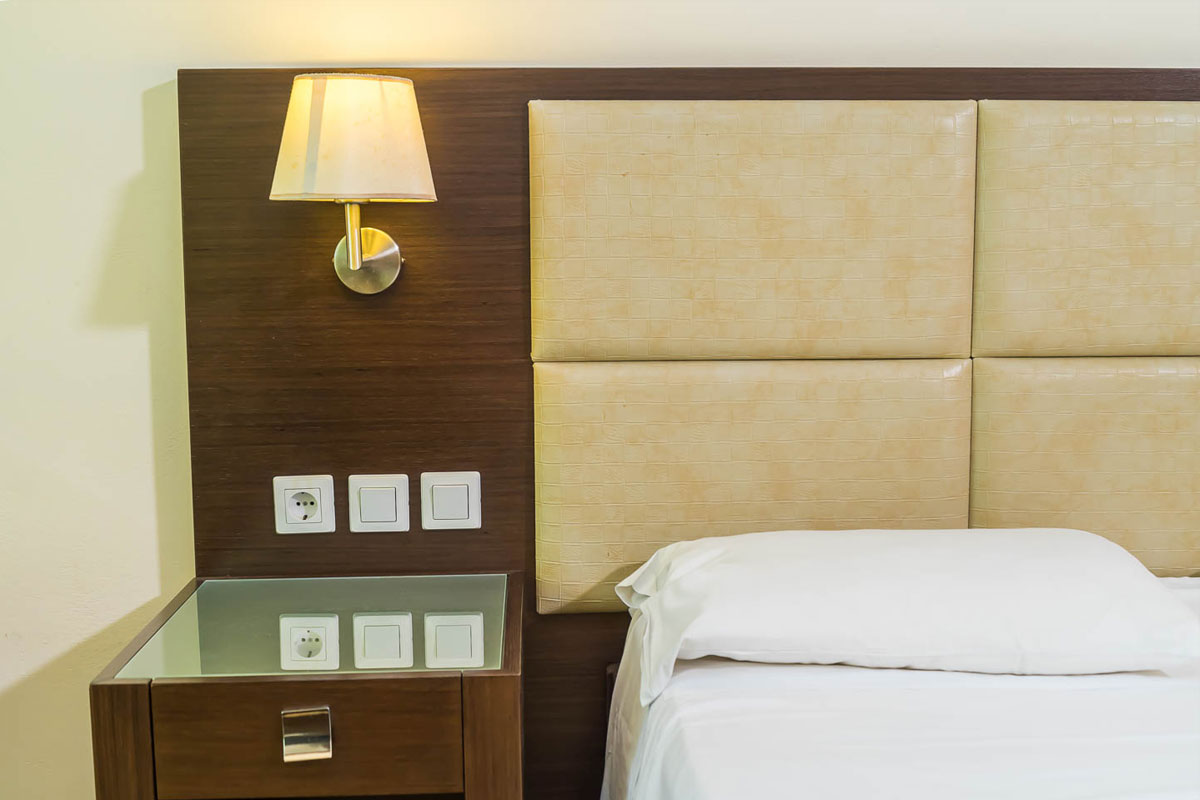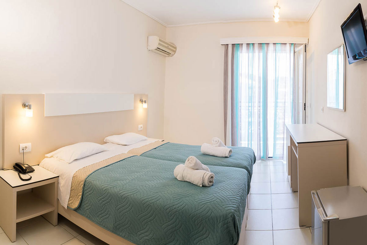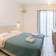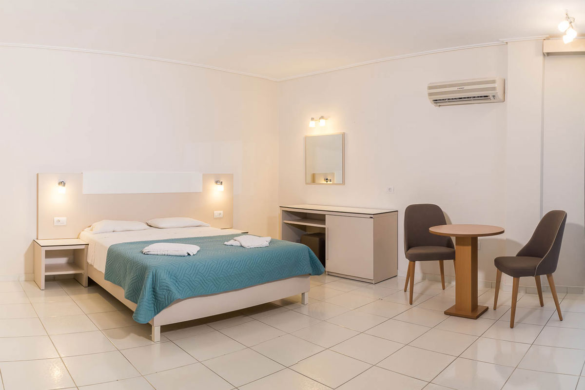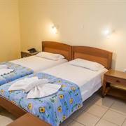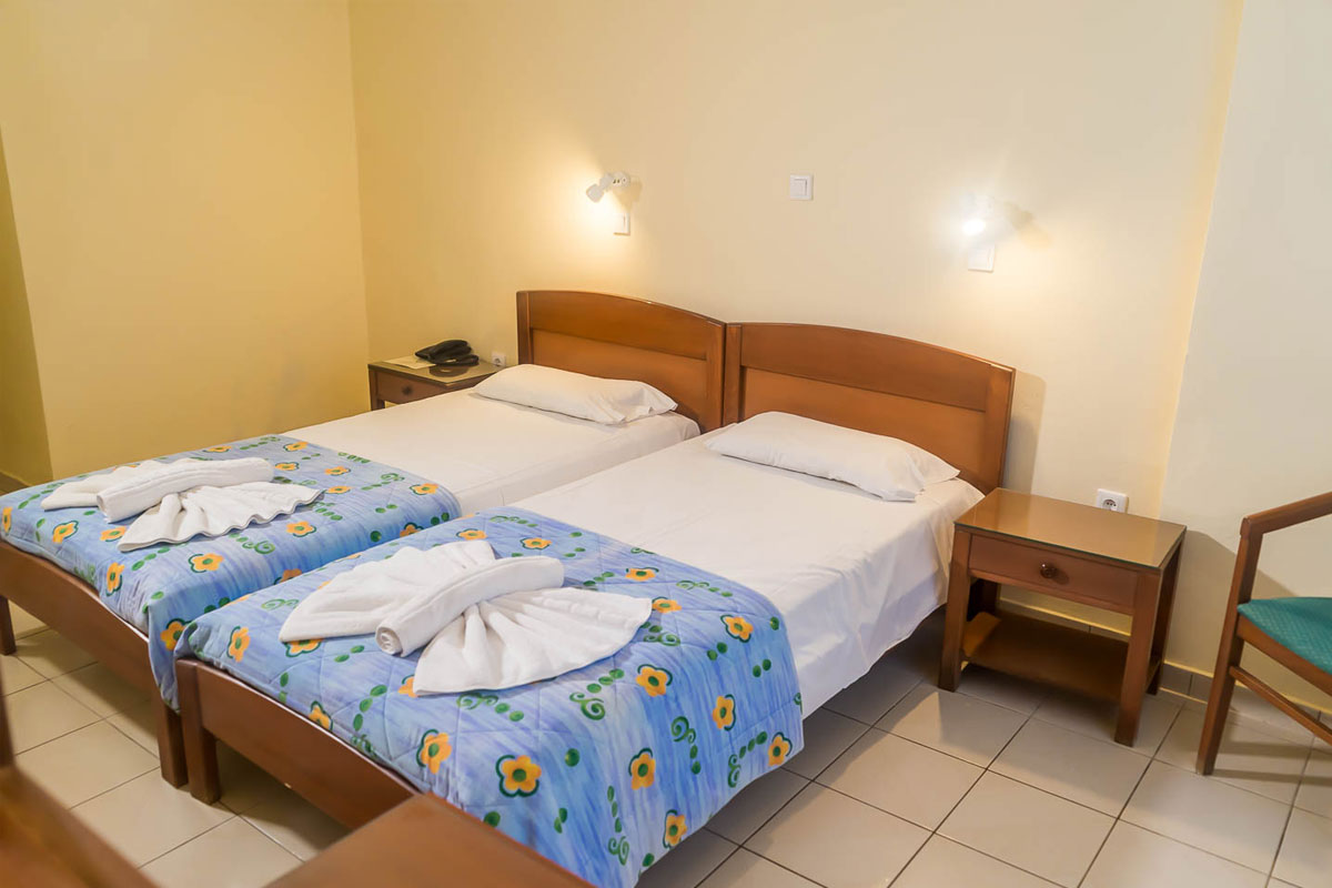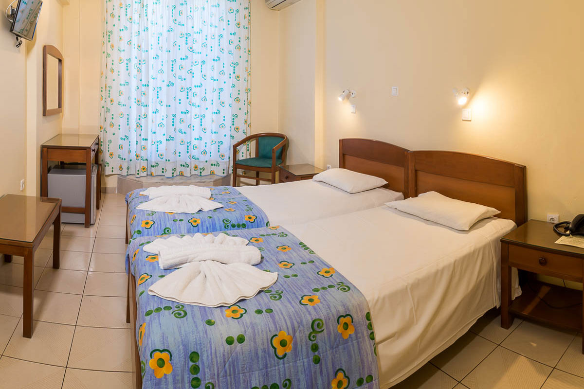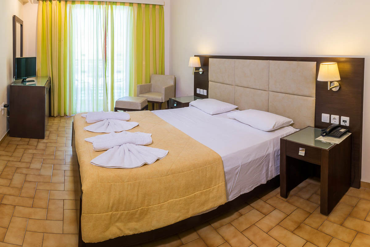 La maggior parte delle camere spaziose e moderne dispongono di due letti singoli e si affacciano sulla piscina tuttavia ci sono letti matrimoniali e suite familiari disponibili. Le suite familiari sono fornite di da camera da letto principale con letto matrimoniale, seconda camera con due letti singoli, telefono con linea diretta, radio, telecomando aria condizionata, bagno con vasca, doccia e WC e balcone o veranda.
