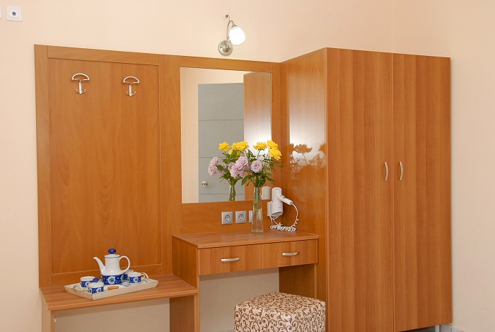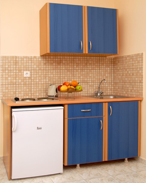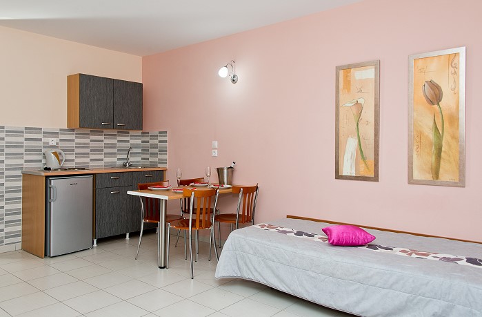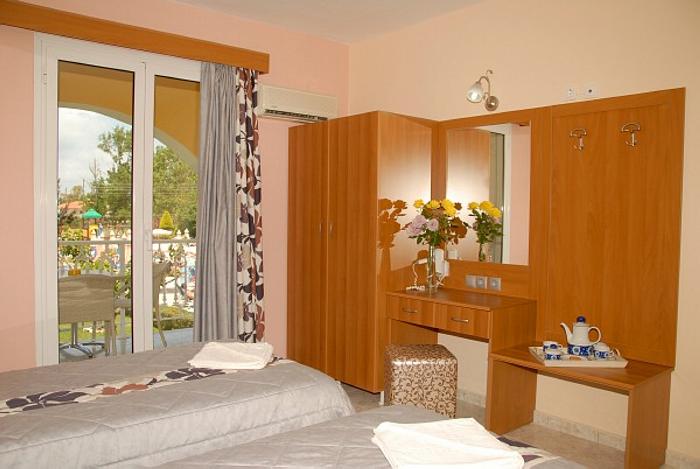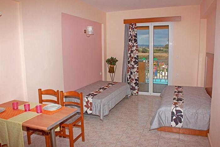 Gli spaziosi monolocali del Macedonia presentano aria condizionata, viste sul giardino o sulla piscina, angolo cottura con fornelli e mini-frigo, zona pranzo e bagno privato con asciugacapelli.